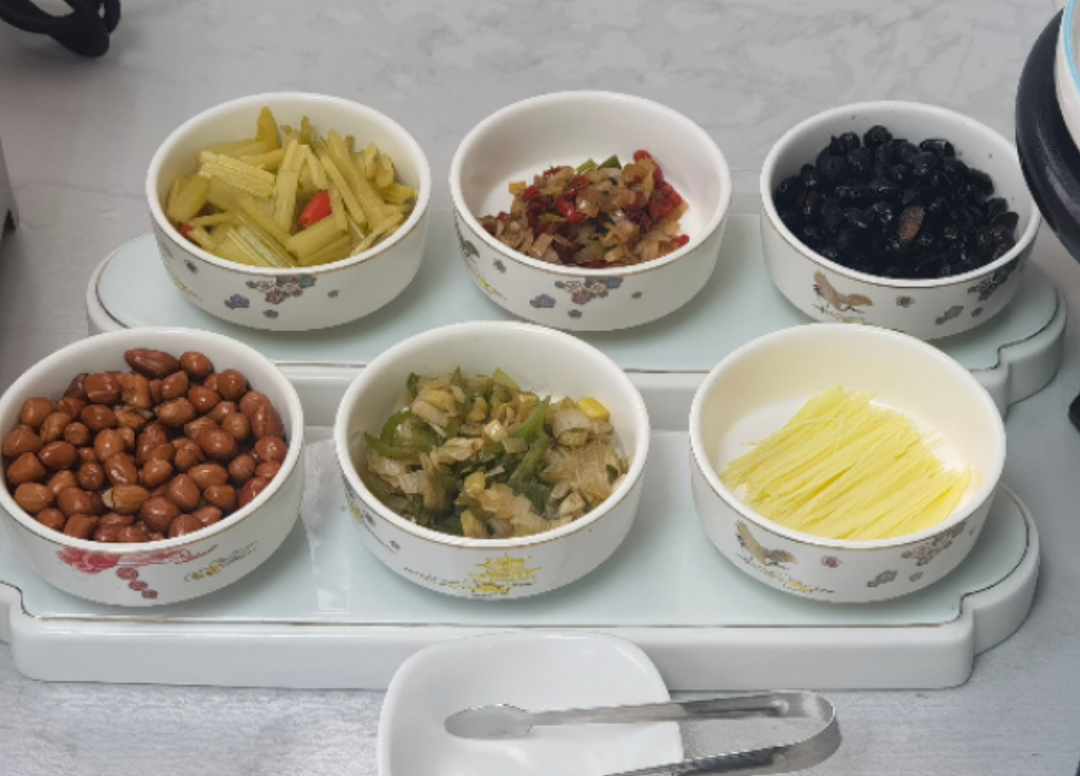 -腌蒜、生蒜、老虎菜、黃瓜絲、胡蘿卜絲、土豆絲、豆腐條-