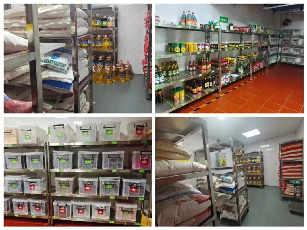 在濱西辦公區(qū)的倉庫內(nèi),一排排、一層層碼放整齊的調(diào)味品、米面油等食材,仍保持著天天有更新、日日有補充。