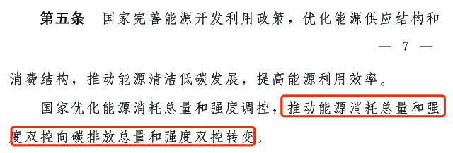 第五條:國(guó)家完善能源開(kāi)發(fā)利用政策,優(yōu)化能源供應(yīng)結(jié)構(gòu)和消費(fèi)結(jié)構(gòu),推動(dòng)能源清潔低碳發(fā)展,提高能源利用效率。國(guó)家優(yōu)化能源消耗總量和強(qiáng)度調(diào)控,推動(dòng)能源消耗總量和強(qiáng)度雙控向碳排放總量和強(qiáng)度雙控轉(zhuǎn)變。