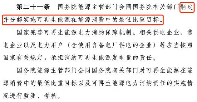 第二十一條:國(guó)家完善可再生能源電力消納保障機(jī)制。相關(guān)供電企業(yè)、售電企業(yè)以及電力用戶 (含使用自備電廠供電的企業(yè))等應(yīng)當(dāng)按照國(guó)家有關(guān)規(guī)定,承擔(dān)消納可再生能源發(fā)電量的責(zé)任。國(guó)務(wù)院能源主管部門會(huì)同國(guó)務(wù)院有關(guān)部門對(duì)可再生能源在能源消費(fèi)中的最低比重目標(biāo)以及可再生能源電力消納責(zé)任的實(shí)施情況進(jìn)行監(jiān)測(cè)、考核。