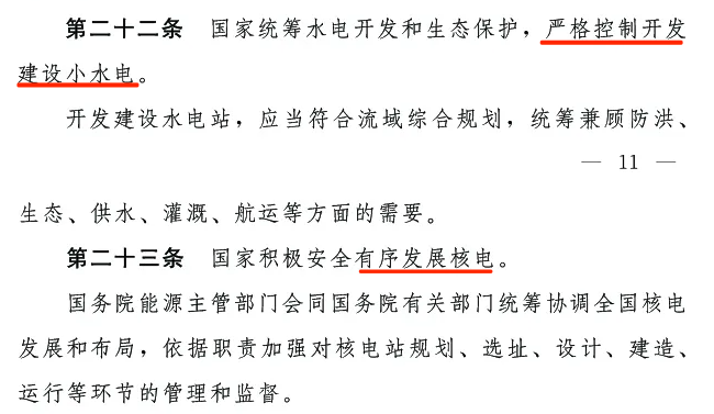 第二十二條:國(guó)家統(tǒng)籌水電開(kāi)發(fā)和生態(tài)保護(hù),嚴(yán)格控制開(kāi)發(fā)建設(shè)小水電。