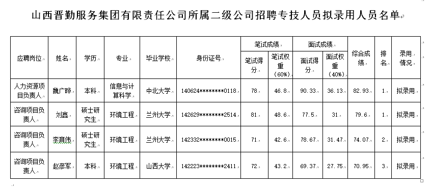 附:山西晉勤服務集團有限責任公司所屬二級公司招聘專技人員擬錄用人員公示名單